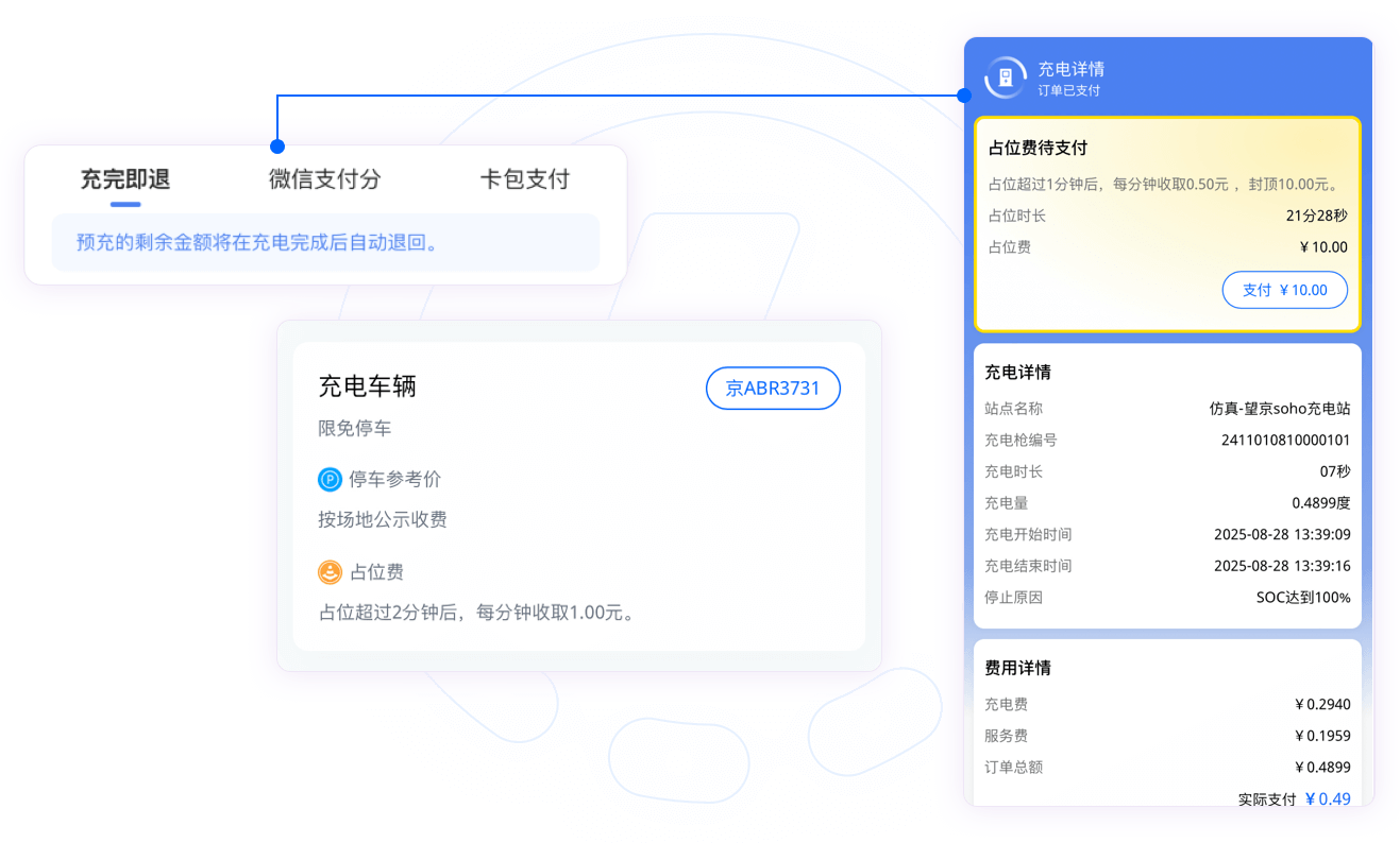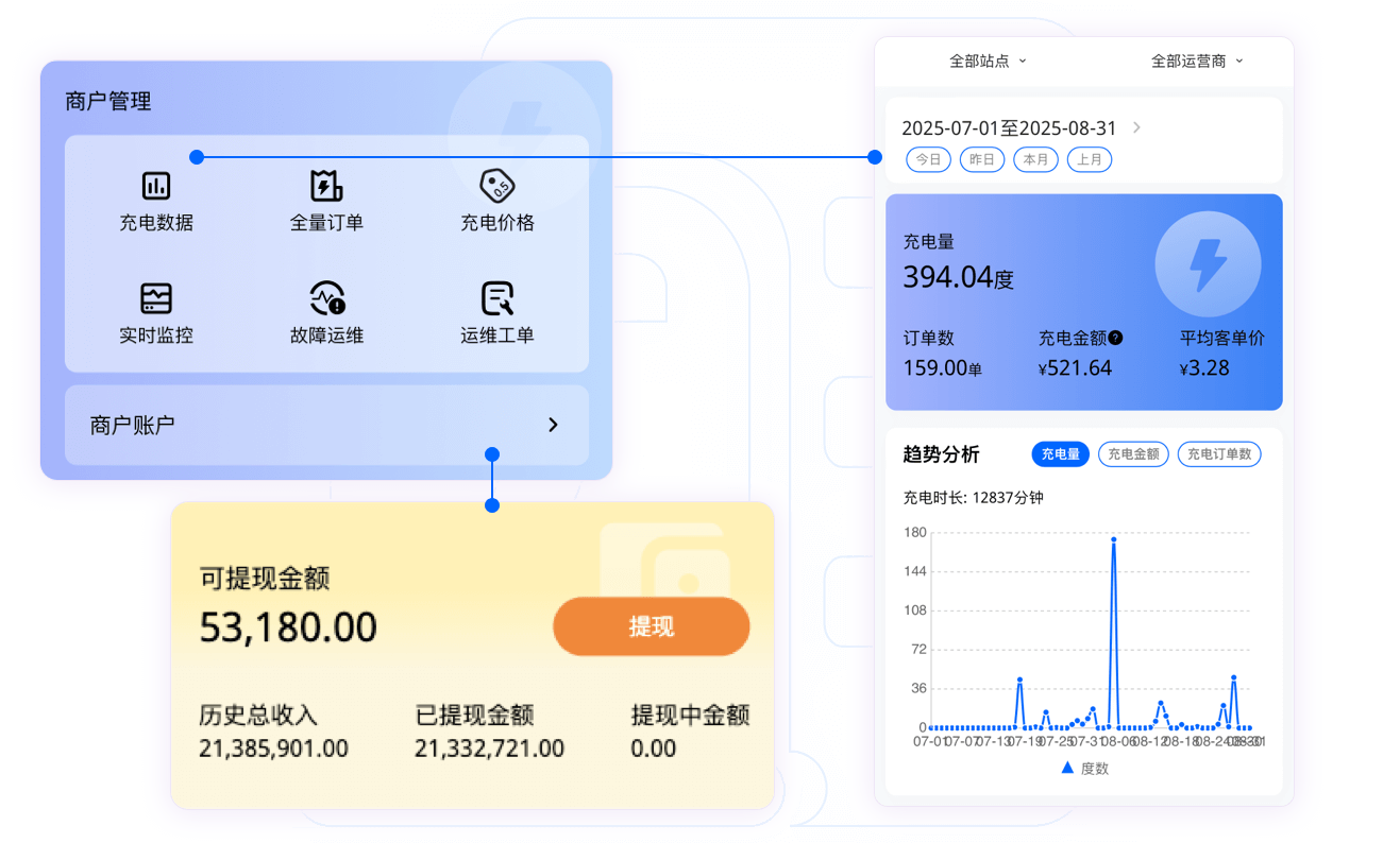 提供完整的订单/报表功能,金额直入业主账户,支持实时分账和加盟模式。